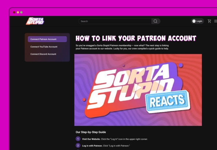 However, the brand faced one main hurdle: their audience members had different subscriptions associated with Patreon and YouTube. To ensure membership-appropriate access, our developers needed to centralize log-ins for each platform on the Sorta Stupid website.