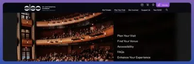 After evaluating every page on the domain, we built a new website architecture and an updated mega menu navigation. The utilization of a mega menu nestled content beneath relevant parent pages. For instance, “Plan Your Visit” features child pages related to finding venues or enhancing experiences before attending performances.