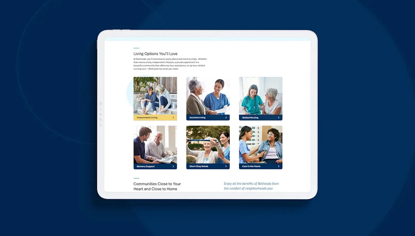 Across all its services, Bethesda sees community not as a perk — but a way of life. We feel this perspective is perfect for senior living marketing, and uses the community as a design element. One of our chief design goals was to highlight the fun, diverse people who rely on Bethesda for care. We incorporated custom photography that portrays the personal, meaningful connections that make a Bethesda community so special.