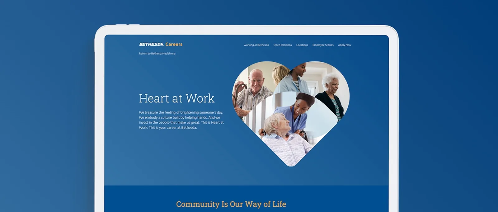 We responded with a custom microsite that pulls at the heartstrings of hardworking professionals who are commited to care. A warm, compassionate tone perfectly aligns with Bethesda’s parent brand and is combined with strong, team-centric messaging that illustrates the intangible value of working in a Bethesda community.