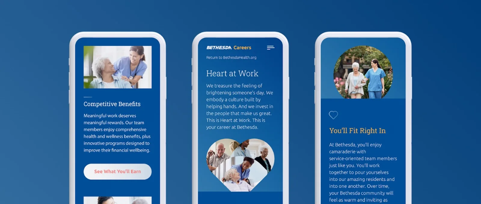 Senior living website design requires special elements tailored to audiences, but we made sure to keep similar elements on the career website. Taking visual cues from the company’s primary website, Bethesda’s career website is straightforward, lightweight and easy to navigate. Its imagery spotlights the one-to-one relationships between team members and residents. Throughout the site, a signature heart icon emphasizes the most valuable trait a Bethesda employee can have: compassion.