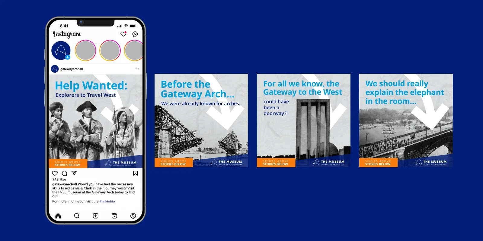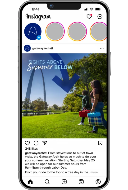 Our copywriters developed content centered around the history held within the six innovative and inclusive galleries in the Museum. Through social media posts, print advertising, video and radio spots, we produced content that revealed interesting details and encouraged more visitors to spend hours or even a whole day discovering something new. Our design team utilized imagery from the past and present to create black-and-white and color images with swipeable details about the museum. They also used vibrant Gateway Arch imagery to showcase the monument we all know and love, with a colorful arrow drawing the eye to what lies beneath its iconic view.