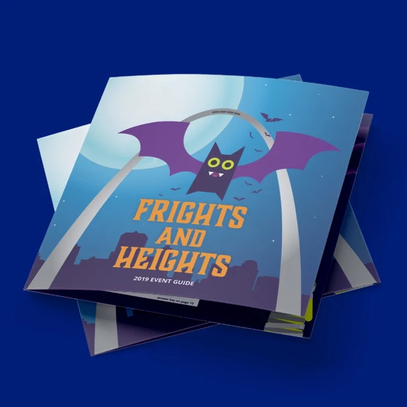 Freights & Heights offered a one-of-a-kind night at the Arch, where families could visit and participate in all kinds of games and activities, including a haunted tram ride and balloon animals. We supported the event with a logo design, promotional signage and social media posts. We even designed an activity book, featuring custom illustrations of Halloween characters that took kids through word searches, crosswords and coloring pages. Once again, working as a travel and tourism marketing agency for such a special St. Louis attraction has been an invaluable experience.